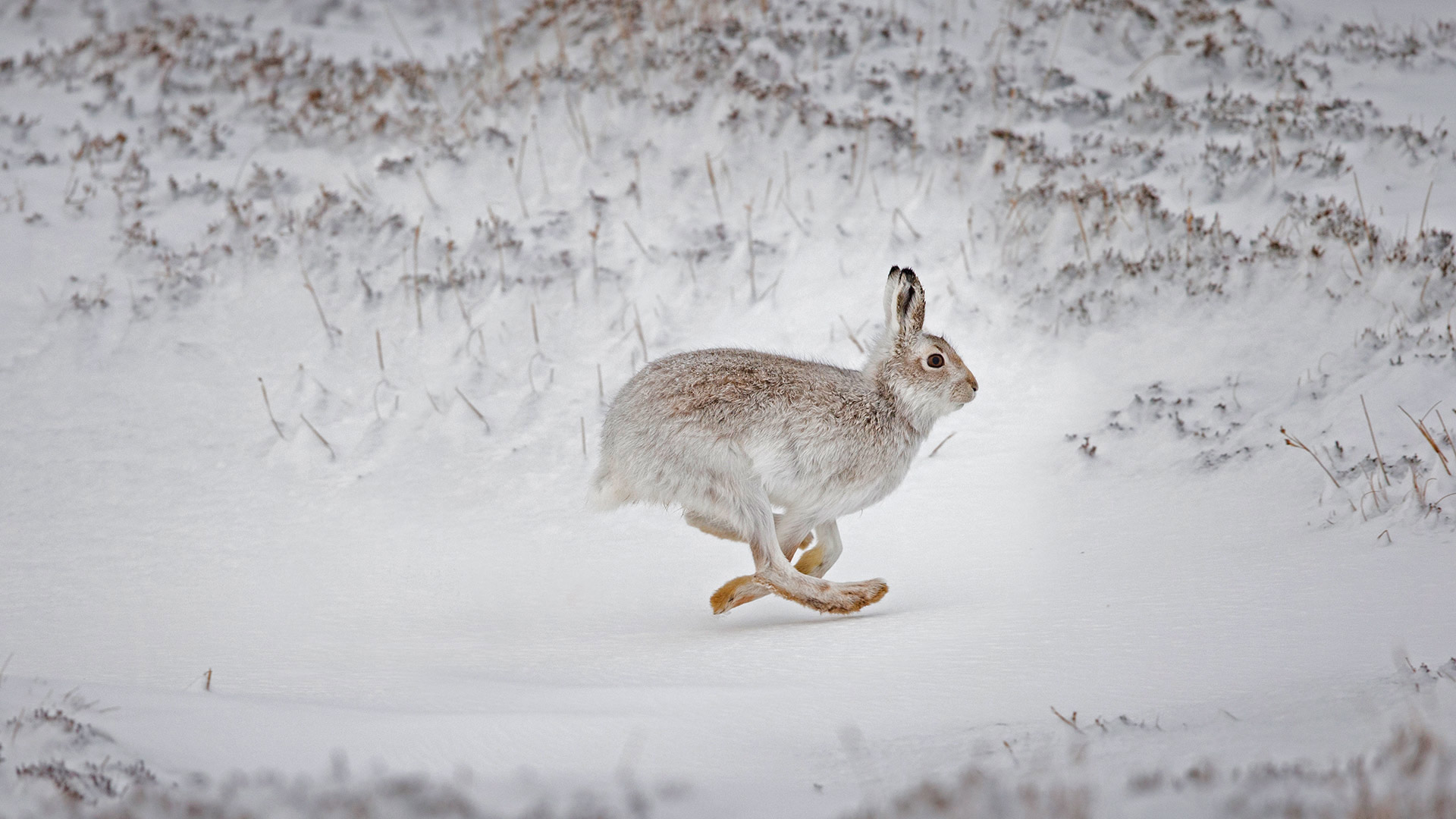 Mountain hare running across snow-covered upland, 苏格兰 (© SCOTLAND: The Big Picture/Minden Pictures)